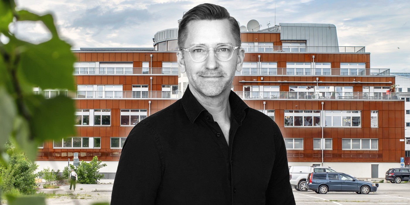 Martin Lindgren in front of the Rotterdam 1 property in Stockholm where Castellum signed a major deal with TV4. The image is a montage.